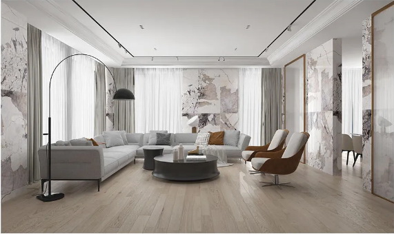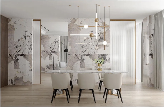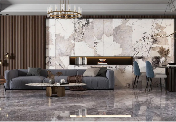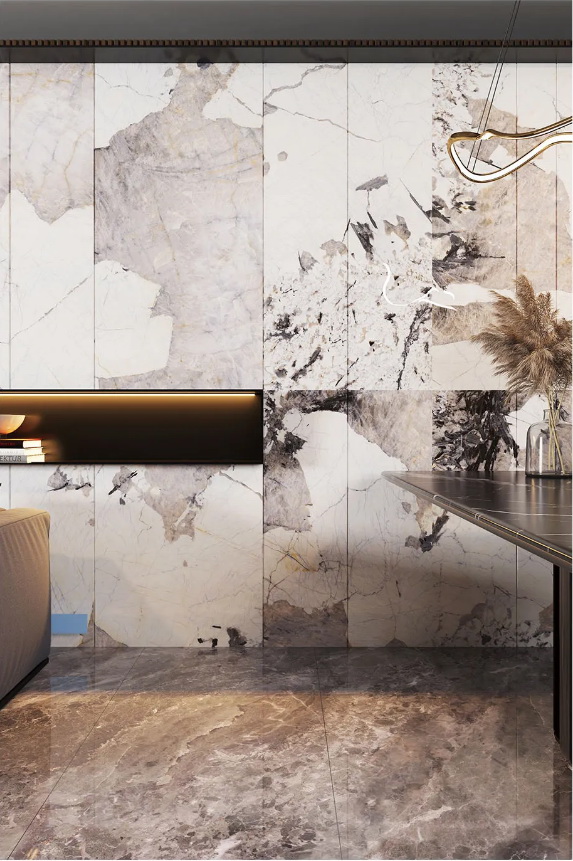 珍稀纹理的暮雪兰带来了富有冲击力的视觉观感,用于背景墙上延绵的肌理看起来就像一幅完整的泼墨画,把大自然的壮阔美景搬进家,为家定下了舒缓、宁静的主调,很好的诠释出了优雅轻奢的意味。